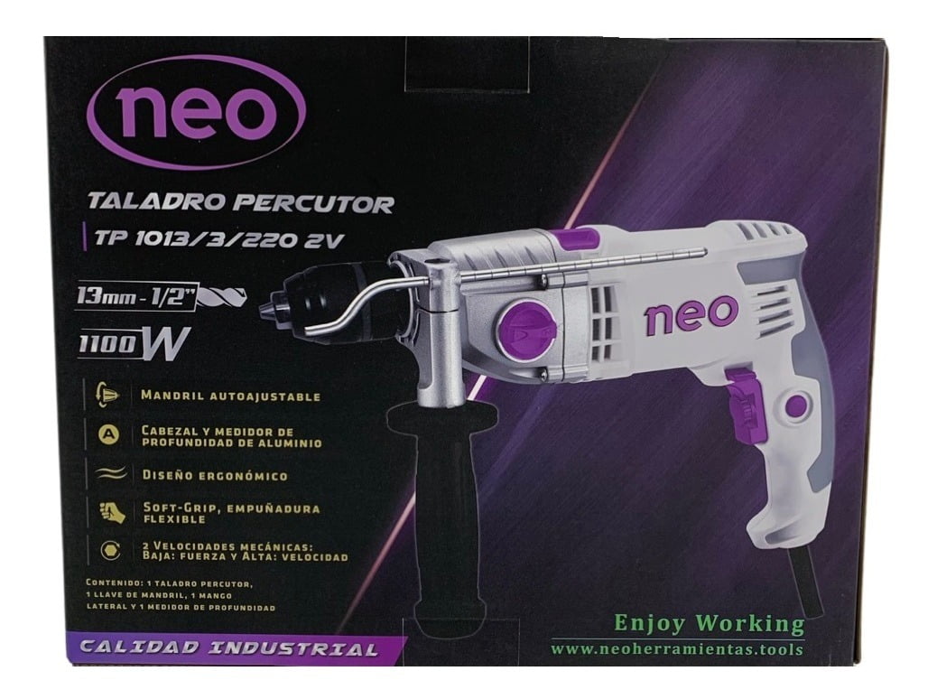 Con el taladro eléctrico Neo TP1013/3/220 2V podrás realizar múltiples tareas en diversas superficies de un modo práctico y sencillo. Su potencia de 1010 W te ofrecerá gran capacidad de perforación.